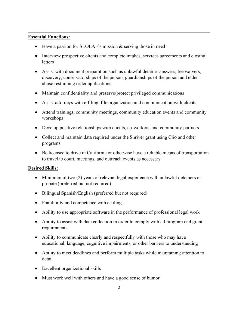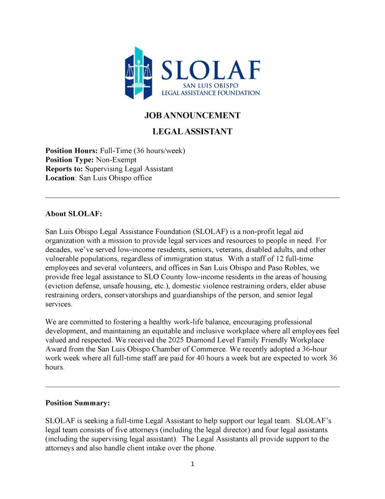 SLOLAF is seeking a full-time Legal Assistant to help support our legal team. SLOLAF’s legal team consists of five attorneys (including the legal director) and four legal assistants (including the supervising legal assistant). The Legal Assistants all provide support to the attorneys and also handle client intake over the phone.