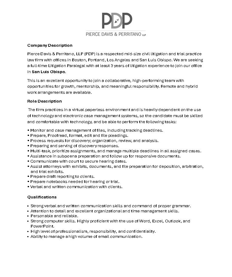 Hall Hieatt Connely & Bowen, LP, a fast paced civil litigation firm seeks full time Paralegal with at least 2 years of experience who is in compliance with B&P 6450. Must have strong knowledge of all phases of litigation, discovery, and trial procedures. Responsibilities will include ability to review and summarize discovery and medical records. Competent in drafting and responding to discovery, document management, preparation of subpoenas and calendaring. Additionally, knowledge with scheduling of depositions, coordination of all details before and during trial, including research, document filing, and preparation of trial subpoenas for experts and witnesses. Must be organized, detail-oriented and have excellent writing skills and able to multi-task and work under pressure. Knowledge of WordPerfect, Word , State, Federal and local Court Rules procedures and deadlines. Communication, organization and detail-oriented skills a must. Salary is commensurate upon experience. Firm offers Medical, dental, vision, life and 401K.